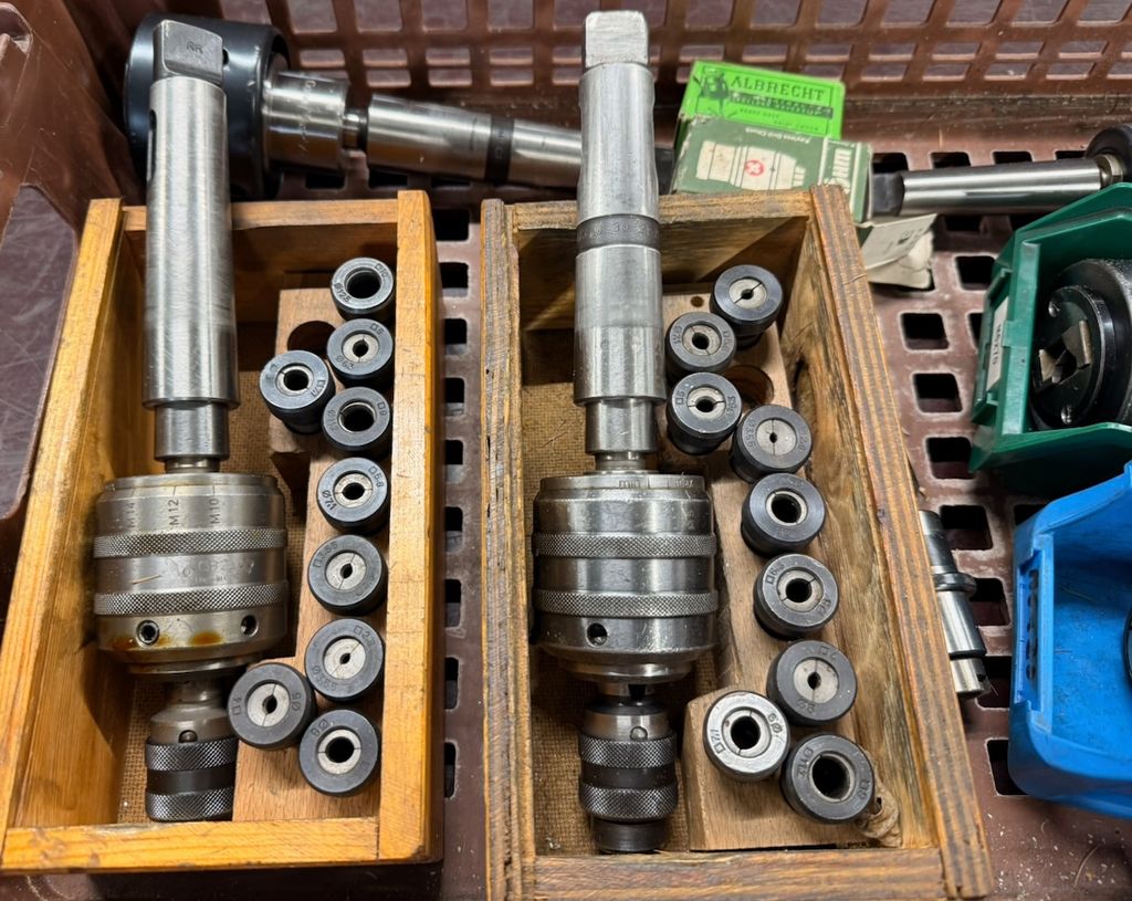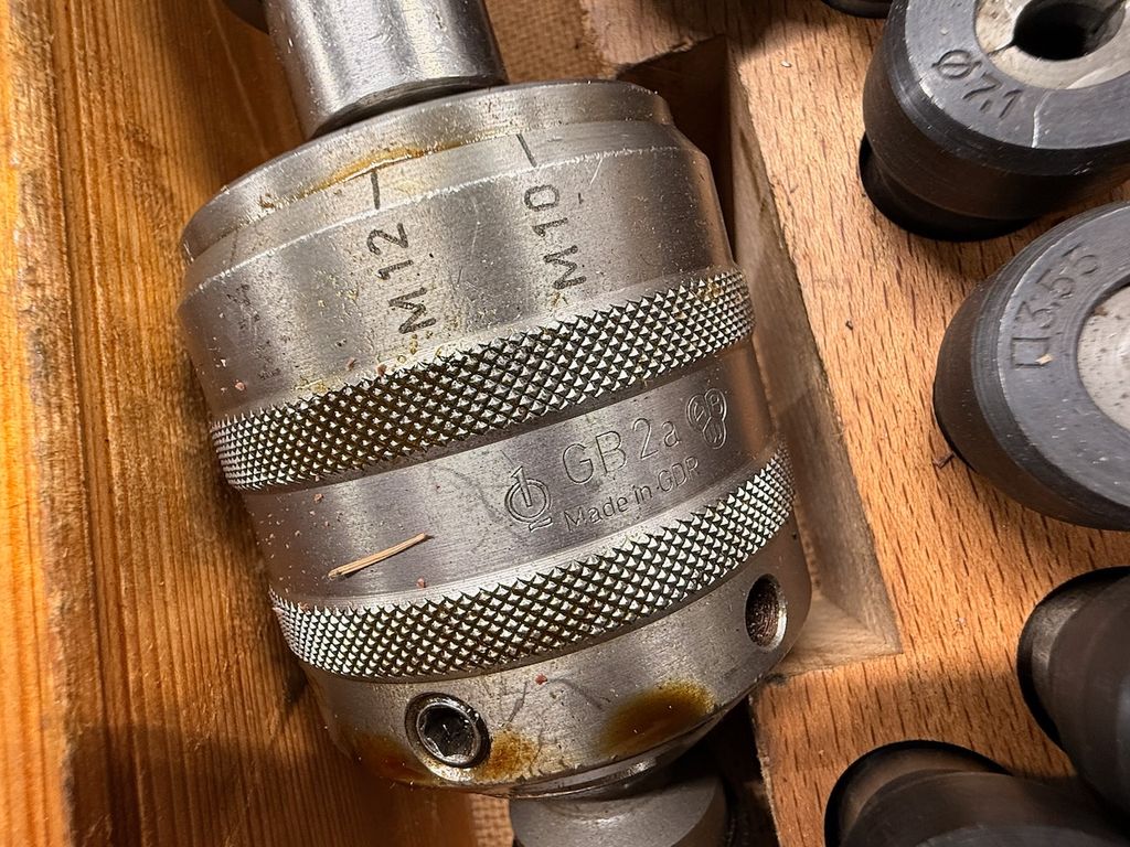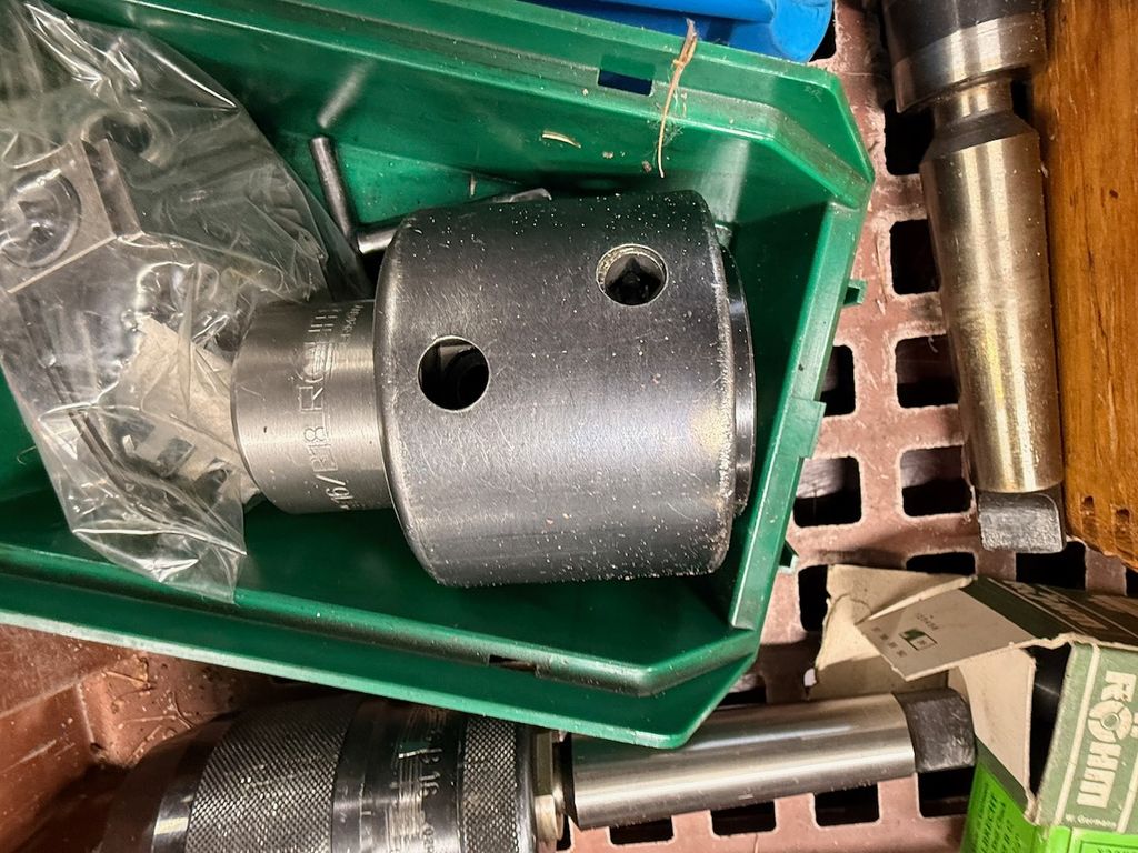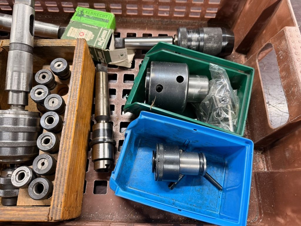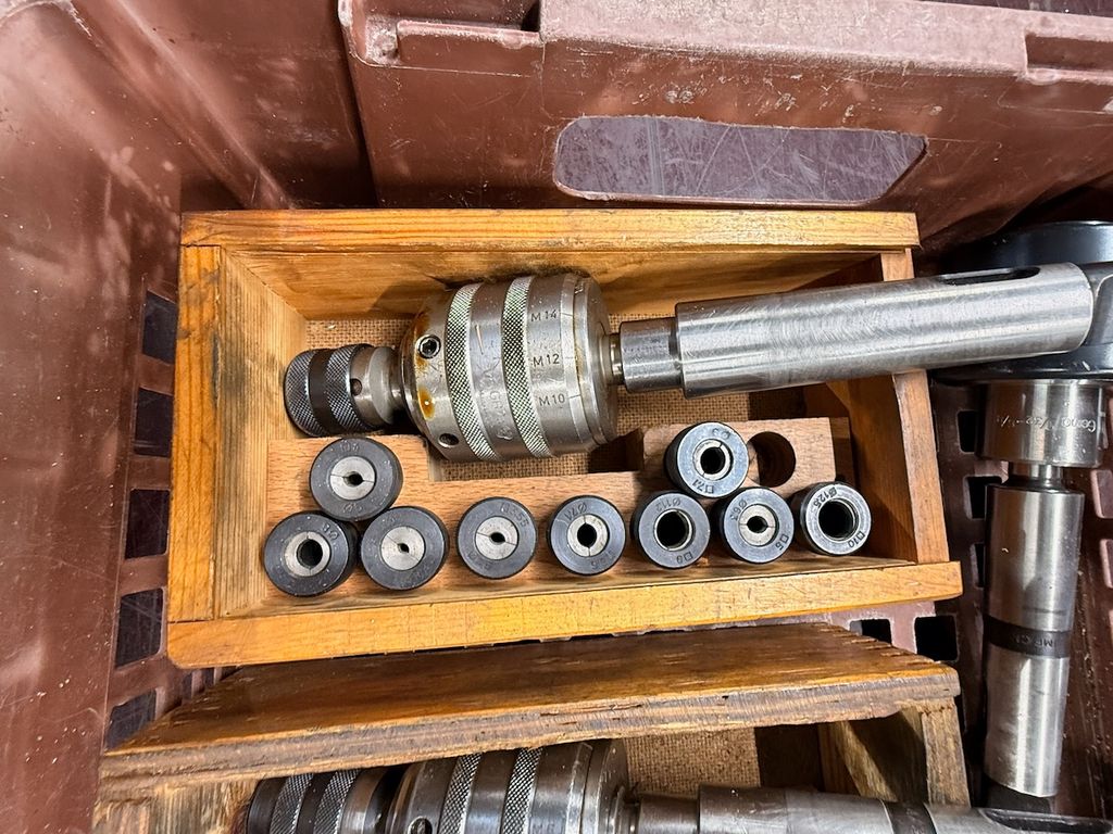Werkzeugposten bestehend aus vier Gewindeschneidfuttern, einem Bohrfutter sowie diversem Zubehör (u. a. Spannhülsen / Einsätze).