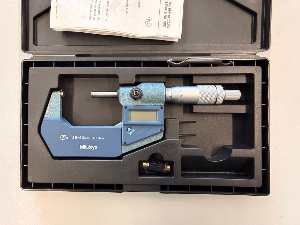 Digitale Bügelmessschraube des Herstellers Mitutoyo aus der Serie MDC. Das Messgerät deckt den Bereich 25–50 mm ab und bietet eine hochauflösende Ablesung von 0,001 mm. Die Ausführung ist IP54-geschützt und somit für den Werkstatteinsatz geeignet.