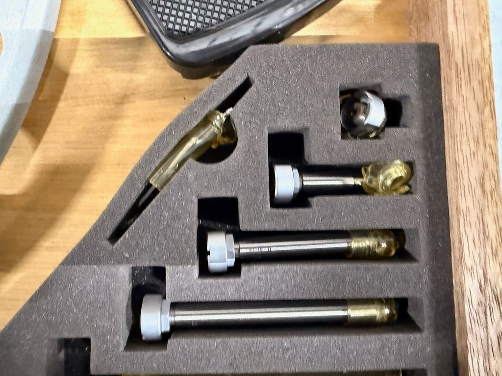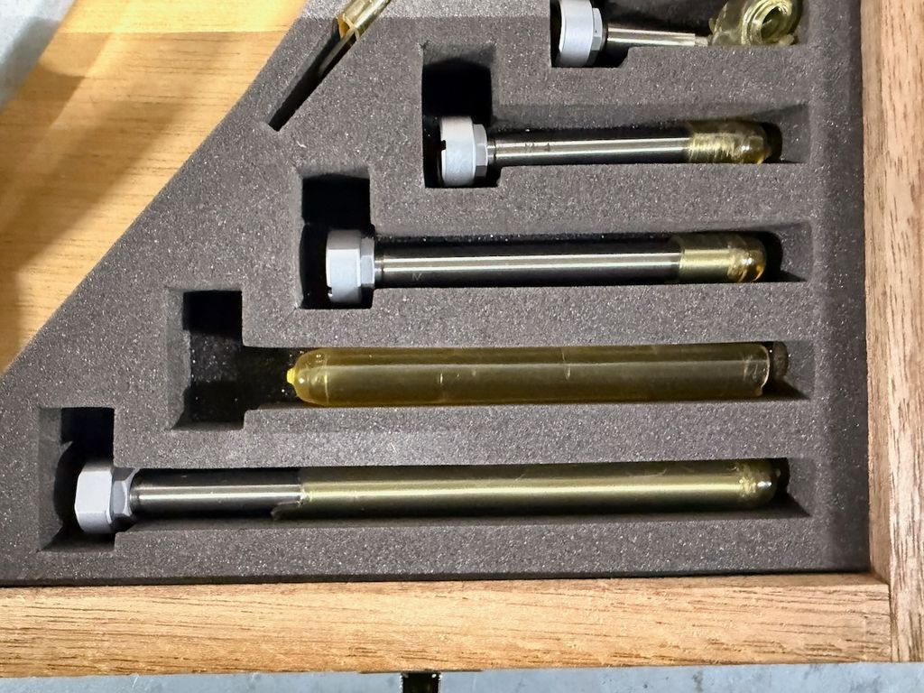 Der Satz ist vollständig, inkl. Elektronikeinheit, Einstellnormale, Zubehör und originalem Holzetui.