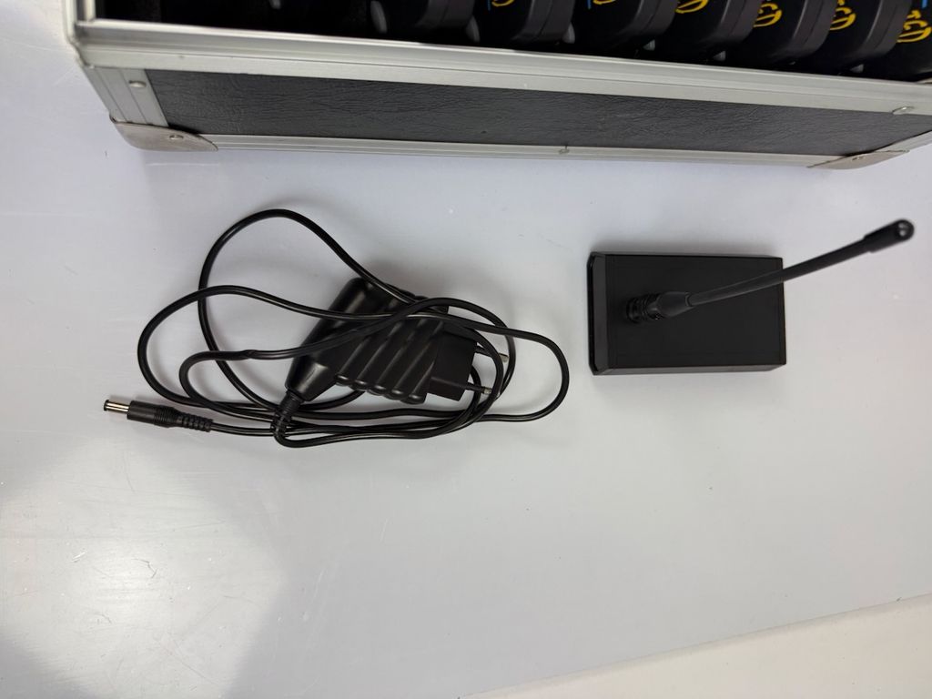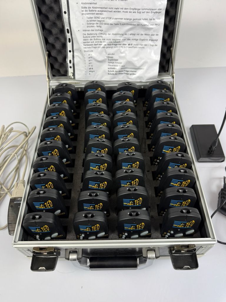 Funkbasiertes TED‑Abstimmungssystem im Transportkoffer; inkl. Empfänger mit Antenne, Netzteil und RS232/USB‑Adapter. Packungsinhalt: 40 Handgeräte.