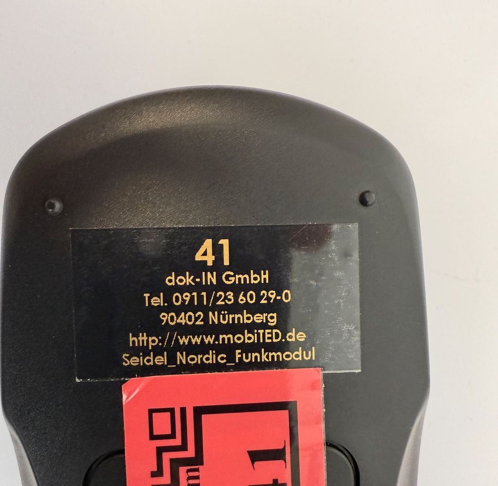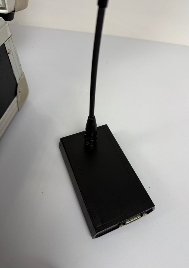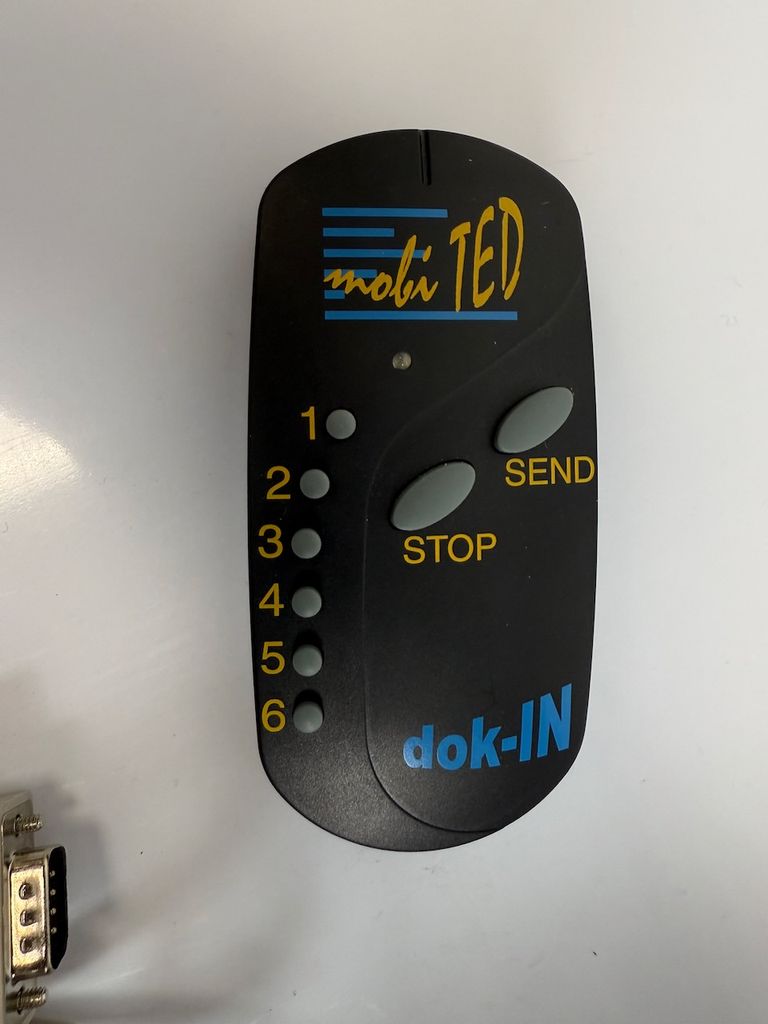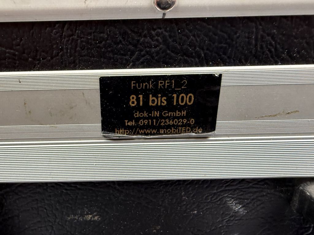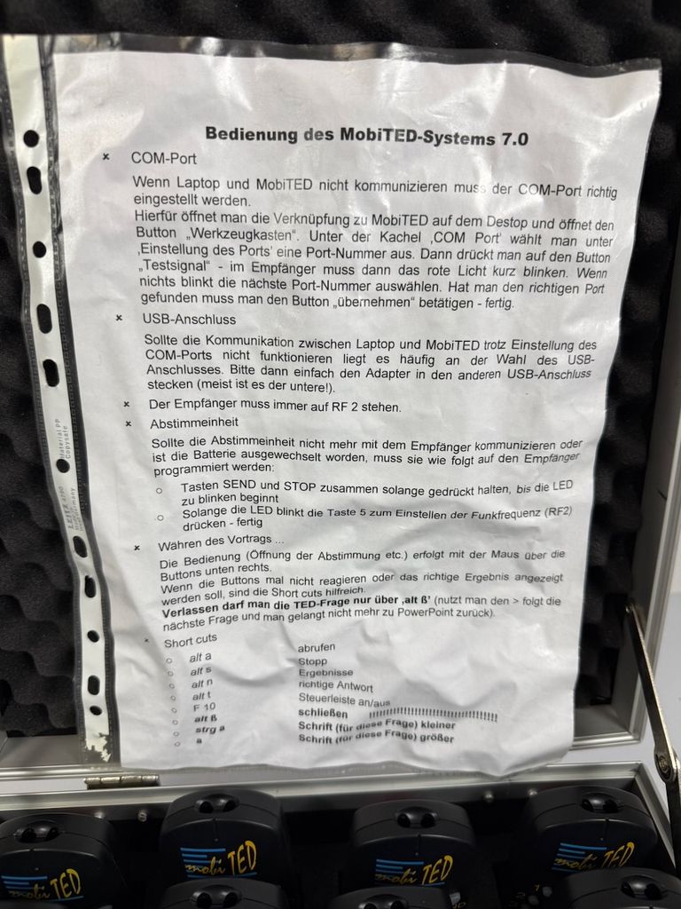 System mobiTED; Funk‑Abstimmung (RF); Empfänger mit COM‑Port/USB‑Adapter; Bedienunterlagen „MobiTED‑System 7.0“ im Koffer.