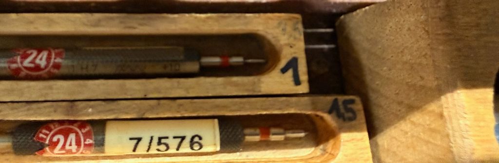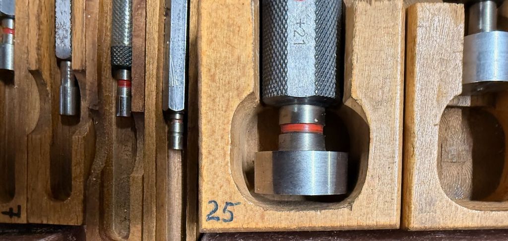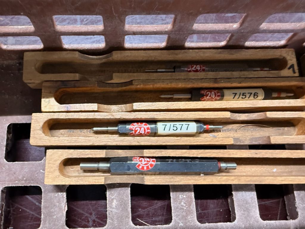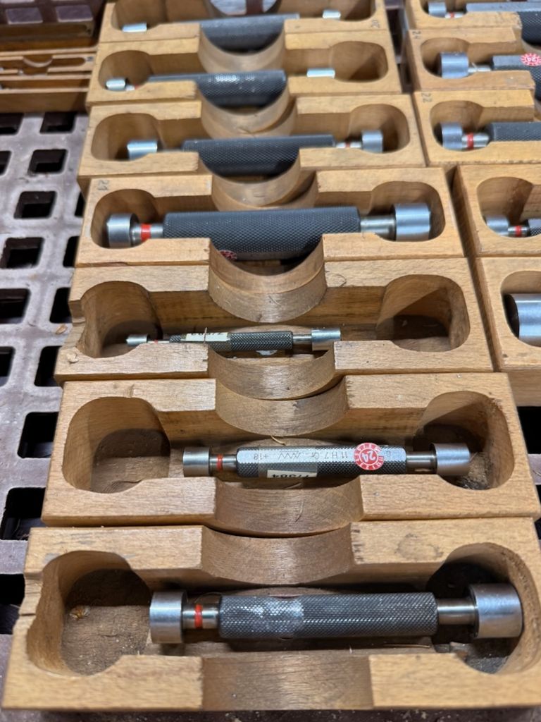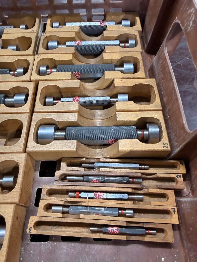 hochwertiger Posten aus Grenzlehrdornen (GO / NO-GO), gelagert in originalen Holzboxen. Die Lehrdorne decken einen Durchmesserbereich von ca. 1 mm bis 25 mm ab.
