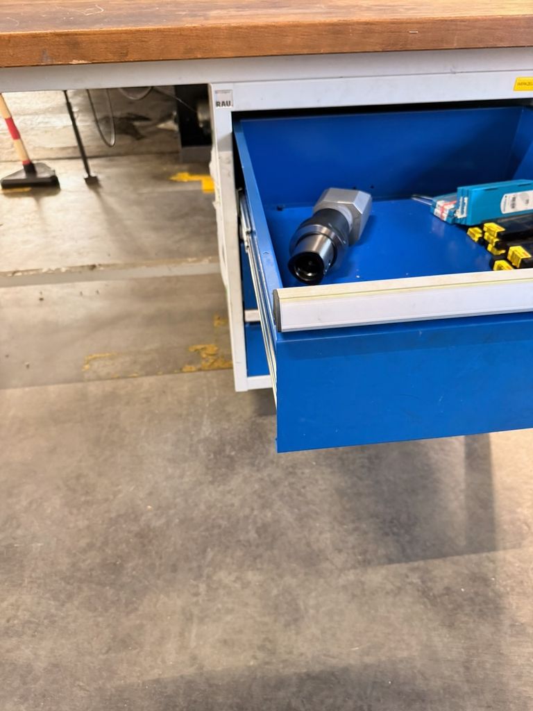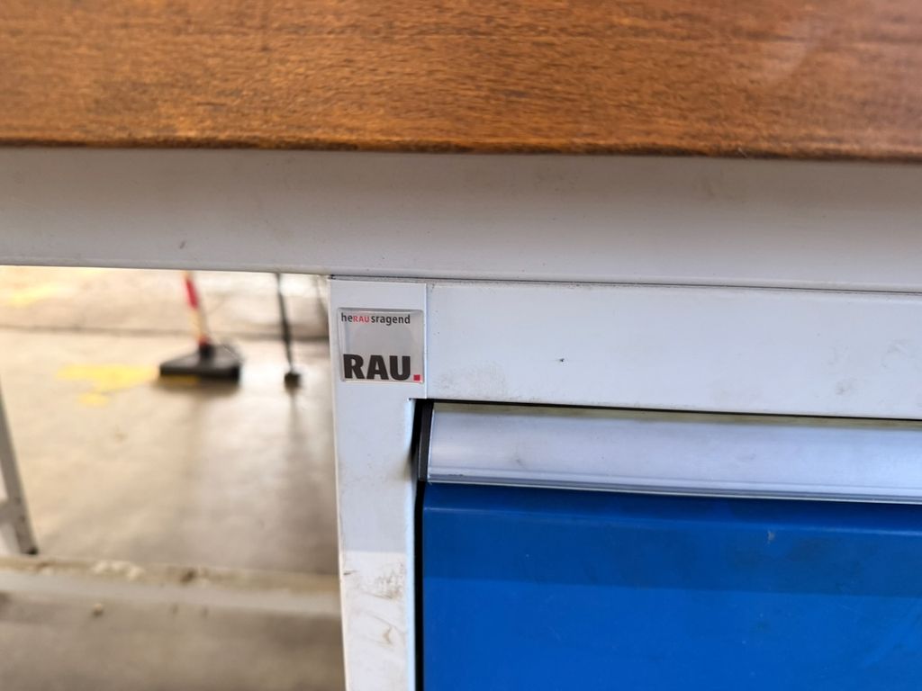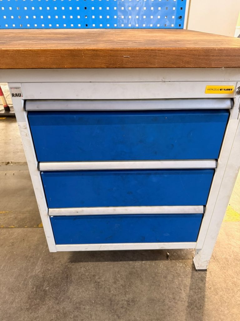 RAU Werkbank 150x90x84 cm Holzplatte Schubladenschrank und Sandvik-Halter