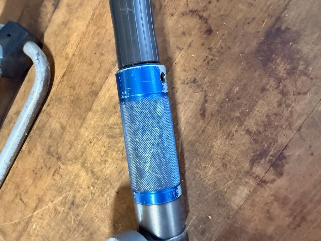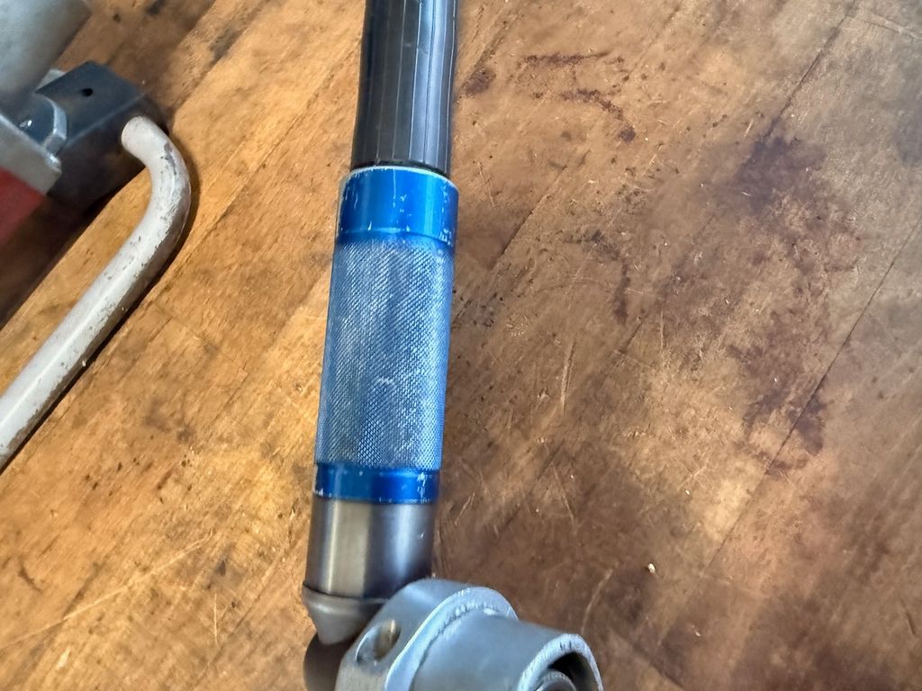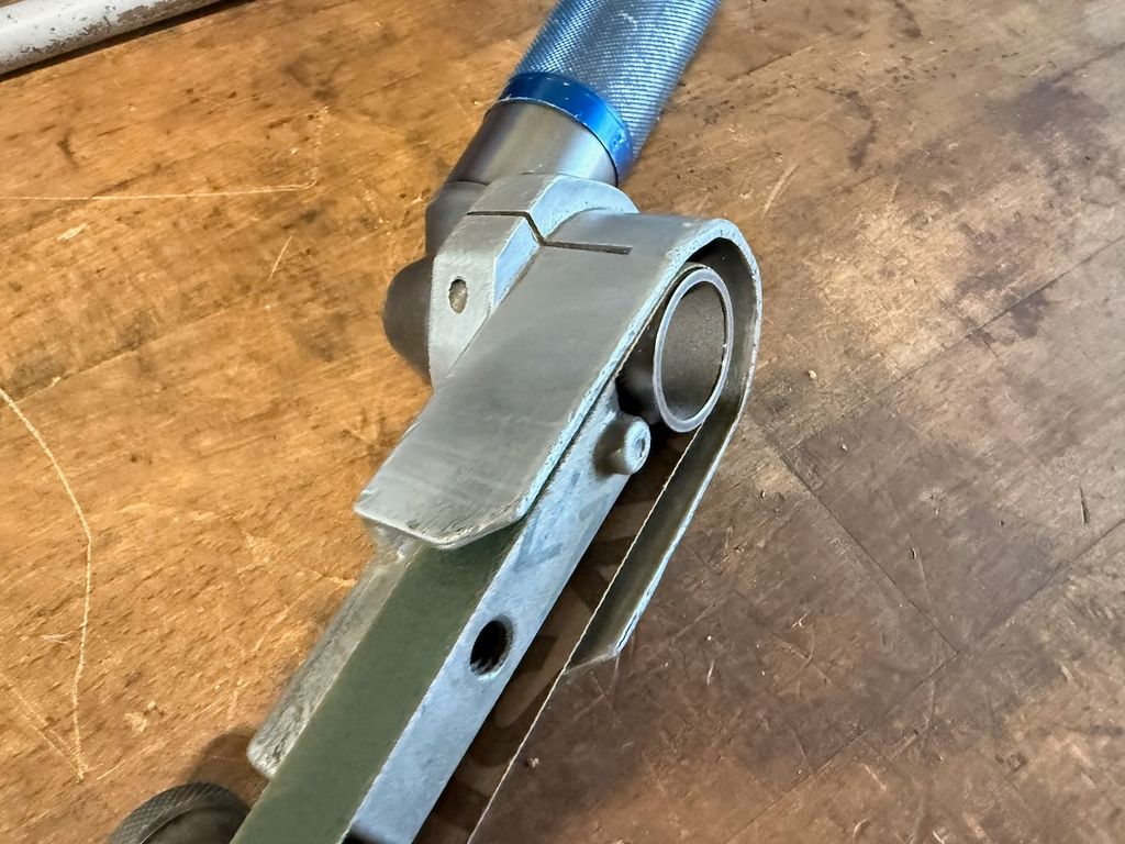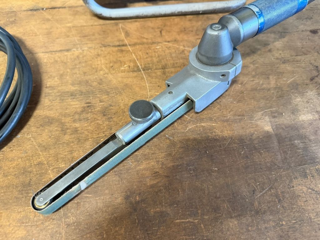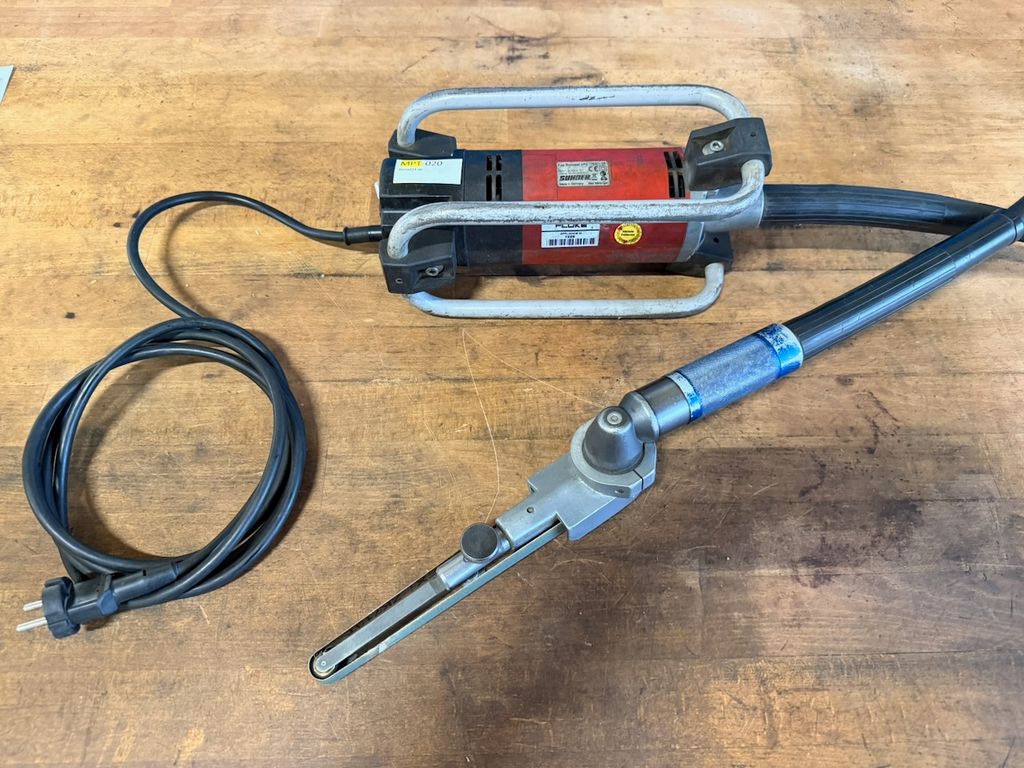 Es besteht aus dem Motorantrieb in einem Rohrschutzgestell und einem flexiblen Wellenantrieb, an dem ein Bandschleifvorsatz montiert ist.