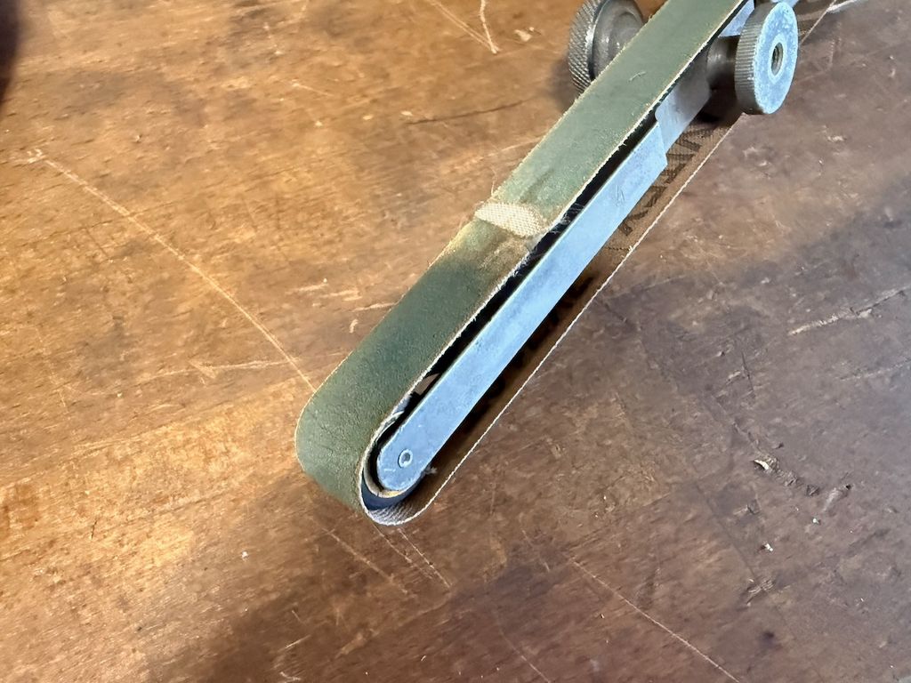 Der Bandschleifkopf ist schwenkbar und auf schmale Schleifbänder ausgelegt.