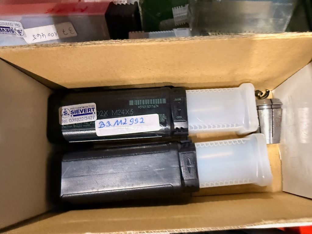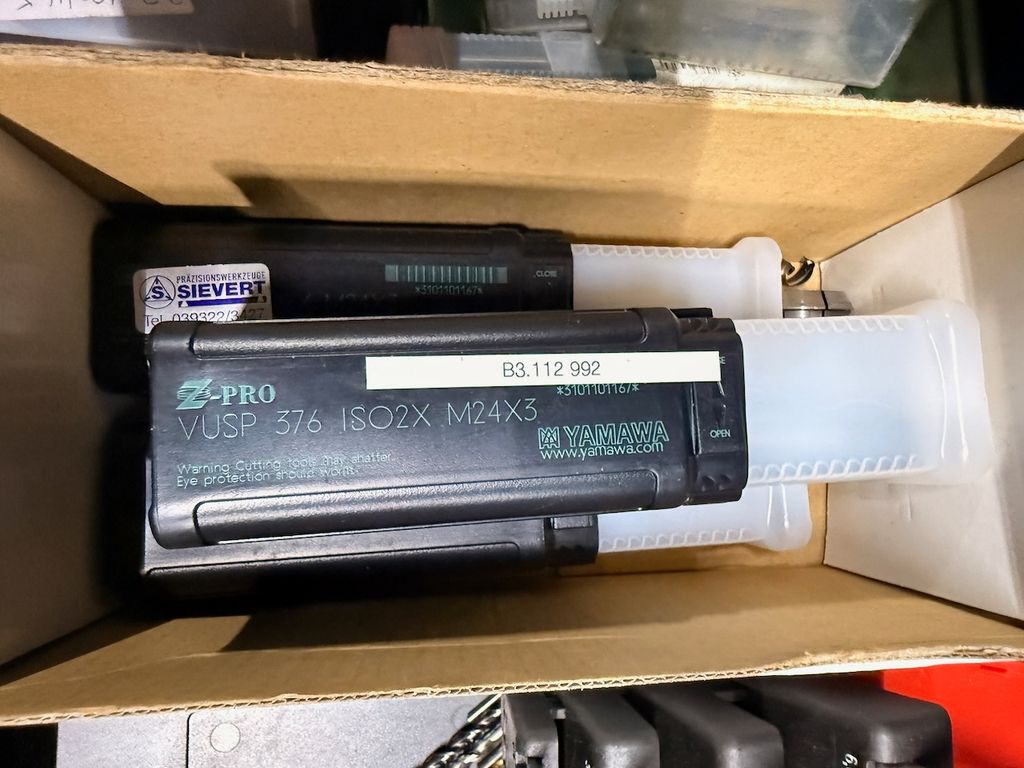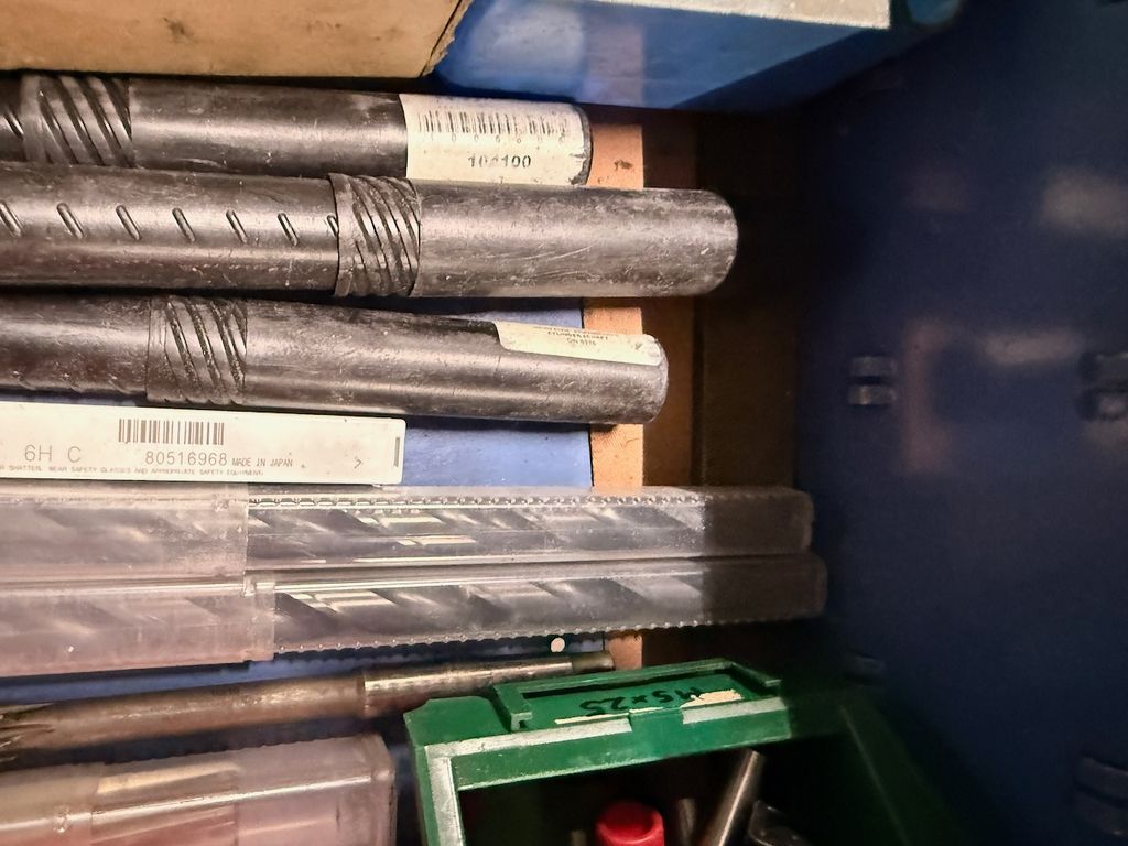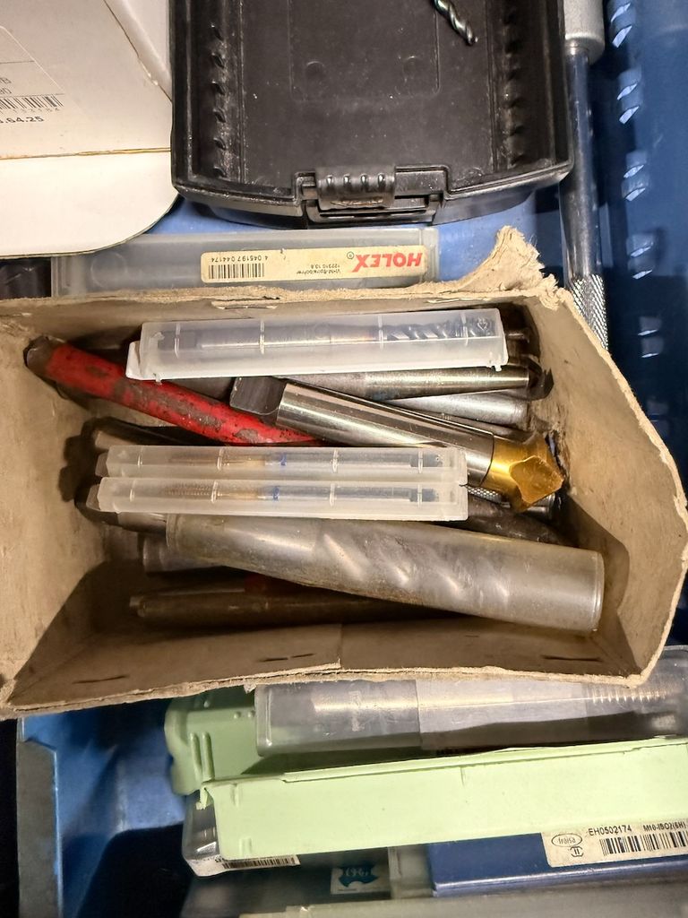 Der Posten besteht aus gemischten Werkzeugen für die Metallbearbeitung. Enthalten sind Spiralbohrer (HSS, HSS-E, TiN, teilweise VHM), Maschinenreibahlen in verschiedenen Abmessungen, Gewindebohrer (u. a. Yamawa, Holex, Gühring), Senkwerkzeuge sowie mehrere Schaftwerkzeuge und Einzelwerkzeuge in Kunststoffboxen.
