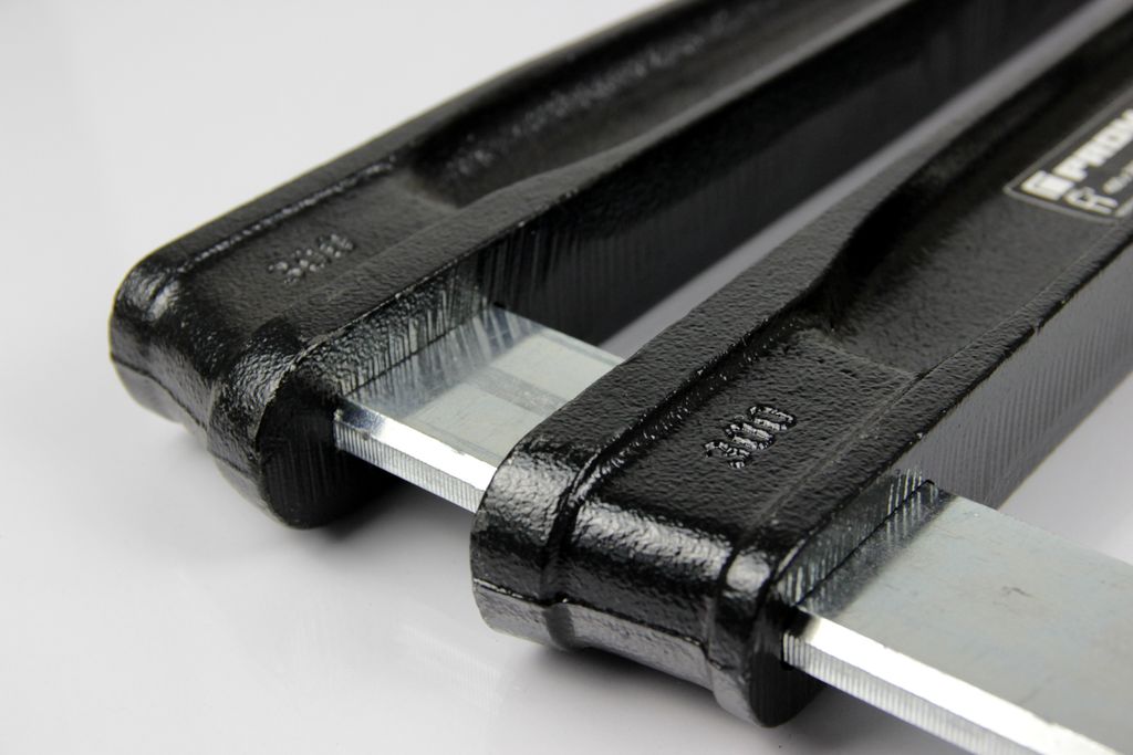 Die Spannarme bestehen aus hochwertigem, verstärktem Temperguss, der für maximale Stabilität und Verwindungssteifigkeit sorgt. Das massive Schienenprofil von 45 x 12 mm garantiert eine verlustfreie Kraftübertragung und verhindert ein Durchbiegen der Zwinge selbst unter extremer Belastung.