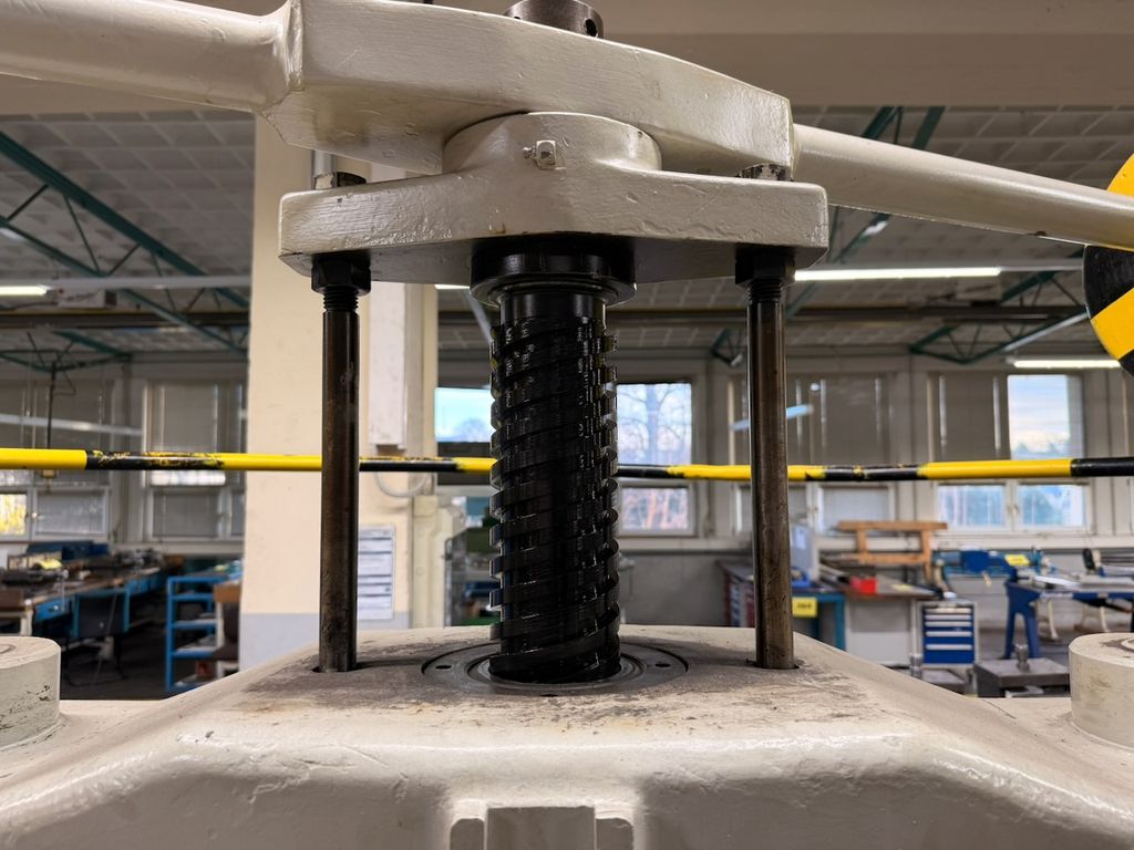 Manuell betriebene Spindelpresse (Balancierpresse) in massiver Gussbauweise aus industrieller Fertigung.