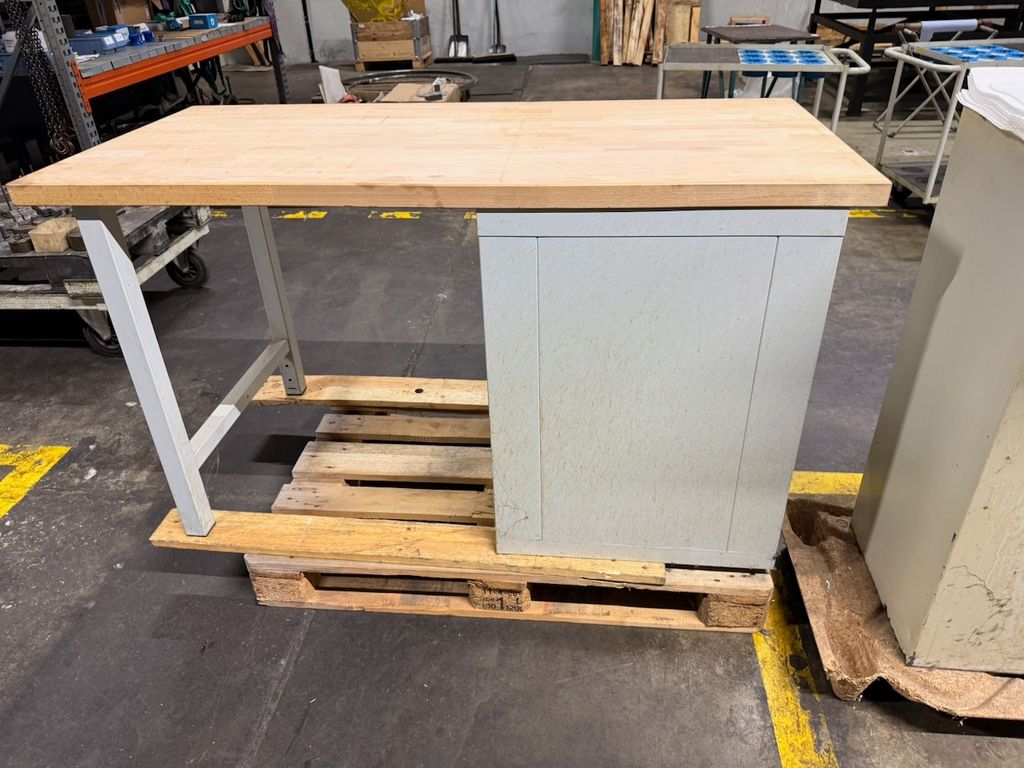 Stabiler Werkstatt-Arbeitstisch mit massivem Buchenholz-Arbeitsblatt und integriertem Wollschläger-Schubladenschrank.